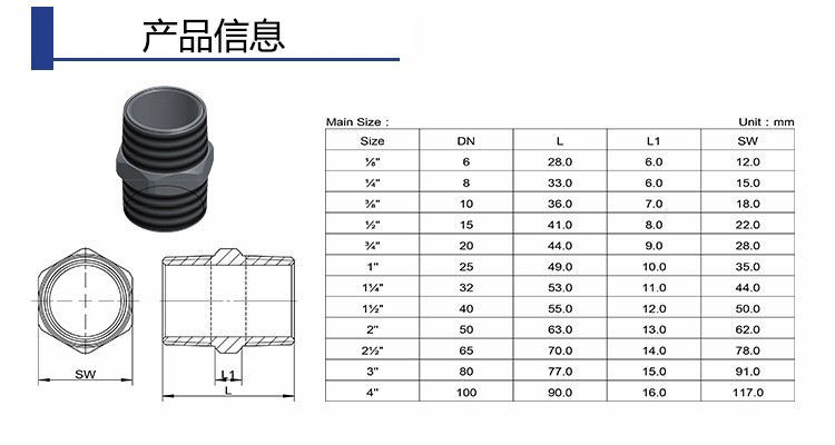 | 不鏽鋼(gāng)六角外(wai)絲接頭(tou) | |